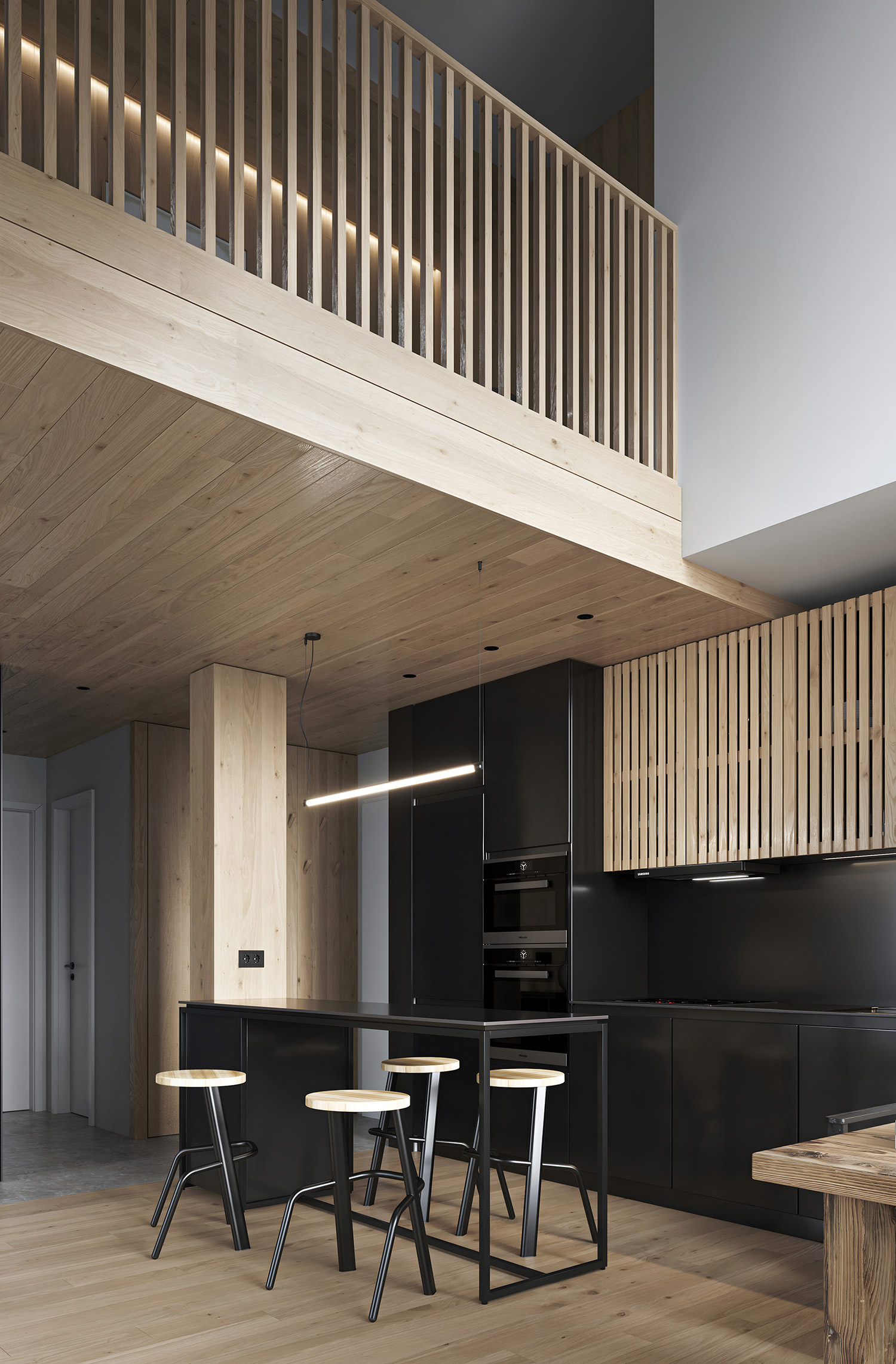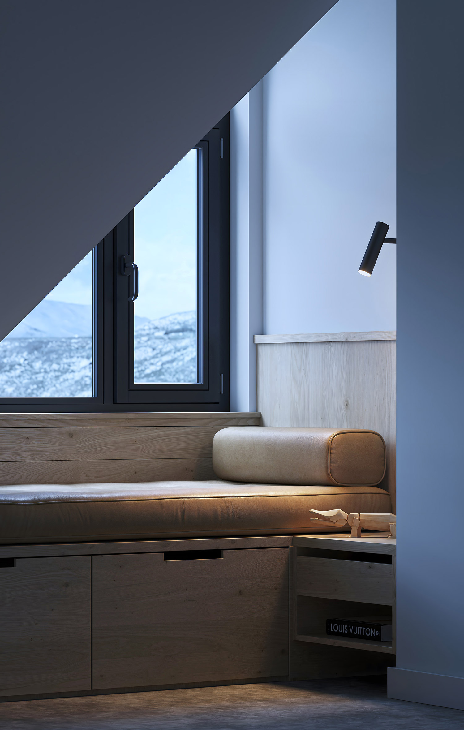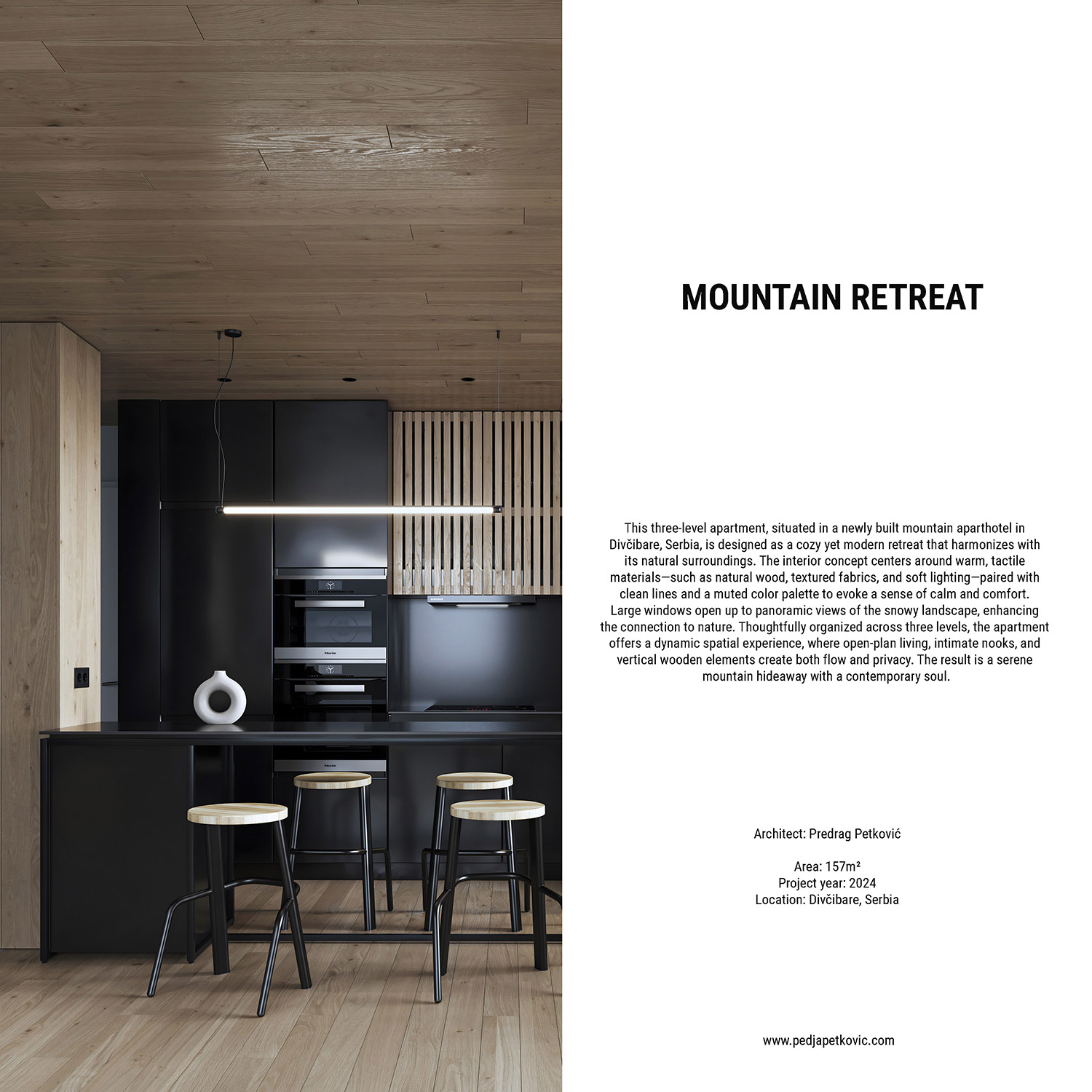 This three-level apartment, situated in a newly built mountain aparthotel in Divčibare, Serbia, is designed as a cozy yet modern retreat that harmonizes with its natural surroundings. The interior concept centers around warm, tactile materials—such as natural wood, textured fabrics, and soft lighting—paired with clean lines and a muted color palette to evoke a sense of calm and comfort. Large windows open up to panoramic views of the snowy landscape, enhancing the connection to nature. Thoughtfully organized across three levels, the apartment offers a dynamic spatial experience, where open-plan living, intimate nooks, and vertical wooden elements create both flow and privacy. The result is a serene mountain hideaway with a contemporary soul.
